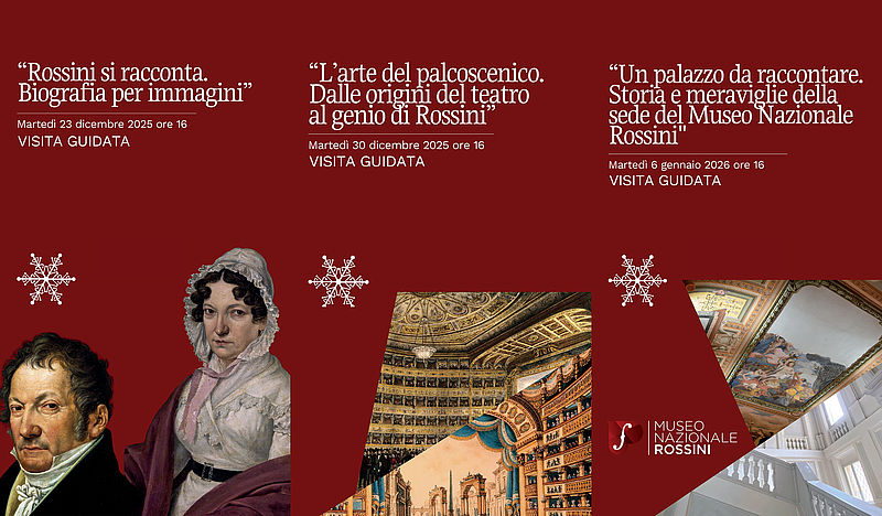 “Rossini si racconta. Biografia per immagini” Aspettando il Natale, visita guidata di approfondimento sulla biografia del grande compositore attraverso i volti e le storie delle persone che hanno fatto parte della sua vita. A partire dall’esegesi dei ritratti conservati nelle sale del museo – da Rossini ai suoi genitori, dagli impresari teatrali alle mogli e alle donne che segnarono la sua esistenza, dai colleghi agli amici e ai rivali – il pubblico sarà accompagnato in un viaggio affascinante tra vicende biografiche e arte figurativa. La ricca galleria di immagini diventa così il filo conduttore per riscoprire la personalità, gli aneddoti e le opere che hanno reso Gioachino Rossini una delle figure più amate e celebrate della musica di tutti i tempi.