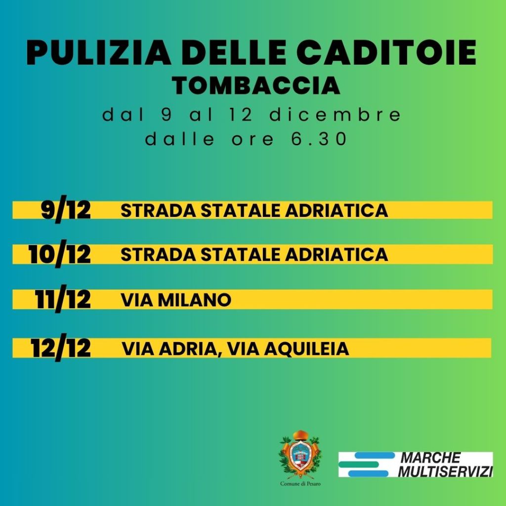 | Continua la pulizia delle caditoie su suolo pubblico della città. Nella settimana da martedì 9 a venerdì 12 dicembre, Marche Multiservizi in accordo con il Comune di Pesaro, interverrà al mattino in diverse vie di Tombaccia (Q9). Il calendario degli interventi che interesserà 202 caditoie: martedì 9 e mercoledì 10 dicembre – strada Statale Adriatica;giovedì 11 dicembre – via Milano;venerdì 12 dicembre – via Adria e via Aquileia. Il turno di pulizia verrà svolto la mattina dalle ore 6.30 alle 12; l’orario potrà subire variazioni per motivi legati al traffico. Per agevolare la pulizia, sono previsti dei divieti di sosta (e rimozione dei mezzi) nelle vie interessate, indicate tramite segnaletica posizionata almeno 48 ore prima dell’intervento. Invitiamo i residenti ad usare senso civico e rispettare i divieti, al fine di poter agevolare il lavoro degli operatori. Oltre alla pulizia delle caditoie verranno eseguiti sopralluoghi specifici da parte di Marche Multiservizi, finalizzati all’attivazione del servizio di spazzamento stradale per rimuovere eventuali residui. L’accordo con l’azienda prevede anche che vengano segnalate le parti “più critiche” della città. Non solo di caditoie, ma anche le tubature che spesso sono ostruite a causa di corpi estranei come gli scarti dei lavori di muratura delle abitazioni (calcinacci) o la spazzatura legata ai cittadini che spazzano la strada. Comune di Pesaro |