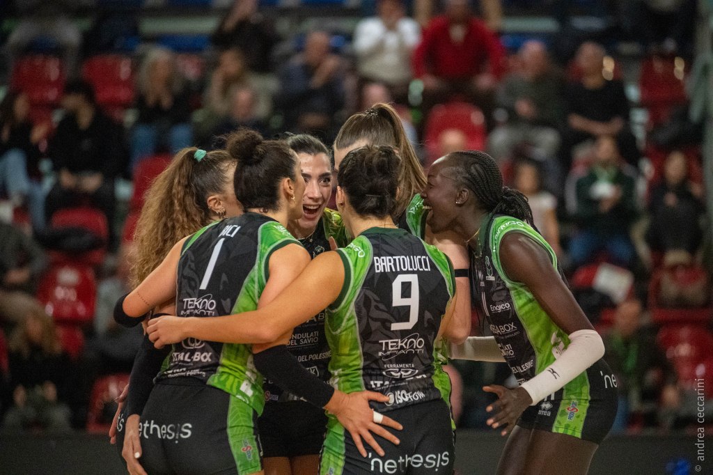 La Megabox Ondulati del Savio Vallefoglia strappa una vittoria non facile ai danni di una coriacea Honda Cuneo, che ha giocato tre set alla pari, spuntandola nel terzo rimontando dal 20-22 e cedendo solo nel quarto parziale. La squadra di Salvagni è stata penalizzata dai troppi errori (30 alla fine, di cui ben 19 in battuta), mentre le tigri di coach Pistola hanno mantenuto la freddezza sufficiente per aggiudicarsi i primi due set in volata e poi il quarto dominato sin dall’inizio. Alla distanza, ha fatto la differenza la panchina lunga delle tigri (Ungureanu, Bartolucci e Thokbuom hanno dato un buon contributo rilevando Omoruyi, Lázaro e Butigan), anche se lo stesso Salvagni ha trovato oro dalla subentrata Koulisiani (10 punti con l’83% in attacco, 3 muri e 2 ace, uno dei quali decisivo per la vittoria nel terzo set). Nella Megabox sempre determinante Bici (19 punti), ottima Ungureanu (14 punti con il 66% in attacco). La vittoria qualifica le biancoverdi ai quarti di finale di Coppa Italia, nei quali affronteranno in trasferta la Savino Del Bene Scandicci.