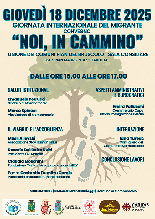 Il 18 dicembre dalle 15 alle 17 presso l’unione dei comuni Pian del Bruscolo (PU), nella sala consiliare di Tavullia (Str. Pian Mauro 47), avrà luogo il convegno “Noi, in cammino”, in occasione della “Giornata internazionale del migrante” istituita dall’ONU, finalizzato a promuovere un momento di incontro e sensibilizzazione sul tema dell’immigrazione. Parteciperanno: Caritas Diocesana di Pesaro, Croce Rossa Italiana comitato regionale Marche, associazione Stay Human onlus, Questura di Pesaro e Urbino.
