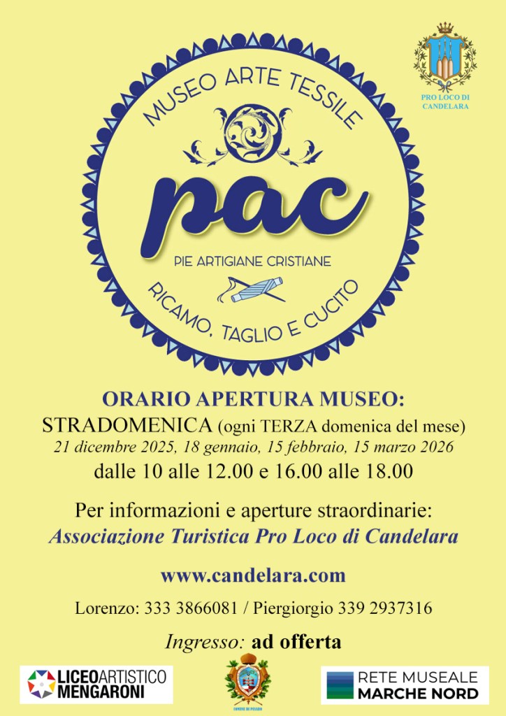 | CANDELARA – 21 dicembre, è tempo di Stradomenica a Candelara: offre come al solito l’apertura del Museo PAC. e concerto di musica classica alla Pieve di Santo Stefano. Il Museo PAC Museo Arte Tessile, ricamo, taglio e cucito, dalle 10 alle 12.00 e dalle 16.00 alle 18.00. Il Museo PAC, aperto nel 2015, è stato recentemente acquistato e restaurato dalla Pro Loco. Il Museo è ospitato al piano terra dell’edificio e si caratterizza per tre saloni, nei quali si raccontano le tre sezioni della scuola: quella di tessitura, quella di ricamo e quella di taglio e cucito. Inoltre, è conservato un grande magazzino delle lane e filati vari. Vi consigliamo inoltre una visita alla Pieve di Santo Stefano, alle istallazioni di arte contemporanea nel borgo e una visita alla vicina Casa Museo di Giovanni Gentiletti. La Sala del Capitano è attualmente chiusa, ma continua nella Sala dell’Orologio la mostra dedicata a Anna Rosa Basile: “Cronos il tempo dell’arte” visitabile però solo su richiesta. Lorenzo Fattori (Direttore Artistico CandelarArte e Pro Loco di Candelara) |