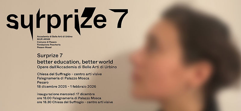 Percorsi che introducono alla scoperta e all’esplorazione del nuovo, aprendo lo sguardo su mondi, alla ricerca di connessioni. La formazione in Accademia di Belle Arti di Urbino approda a Pesaro per la settima edizione di Surprize, la mostra-premio che espone una selezione di lavori di studentesse e studenti, realizzati nei laboratori dell’Istituzione urbinate. Dal 18 dicembre al primo febbraio, saranno accolti in una doppia sede espositiva: la Falegnameria di Palazzo Mosca e la chiesa del Suffragio – Centro Arti Visive Pescheria.