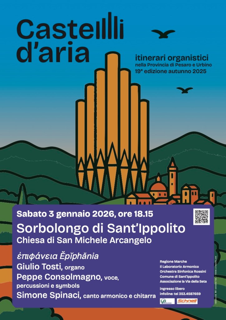 Il 3 gennaio 2026 alle ore 18:15 si terrà a Sorbolongo il penultimo appuntamento della 19° edizione di “Castelli d’aria”. Non si tratterà di un “normale” concerto d’organo ma di una vera e propria produzione originale del festival, nata da una felice intuizione del suo direttore artistico Giovannimaria Perrucci, e che sarà il risultato di una residenza artistica di tre giornate sviluppata attorno all’organo storico della chiesa di San Michele Arcangelo. Protagonisti l’organista Giulio Tosti, noto per il suo approccio non convenzionale allo strumento, Peppe Consolmagno, voce e percussioni e Simone Spinaci, canto armonico e chitarra. Tutti e tre i musicisti provengono dal mondo della ricerca e della sperimentazione sonora, sia pur con percorsi, approcci e sensibilità diverse. Nelle stesse parole del suo Direttore Artistico ecco il senso dell’evento: “I tre artisti lavoreranno per individuare dei punti di convergenza, un focus emozionale e poetico, con l’intento di dare forma a un’idea di “Epifania” da intendersi come misterioso afflato che respira nel silenzio, come esperienza rivelatrice del suono che conduce l’ascoltatore in uno spazio immaginario, tra visibile e invisibile…”