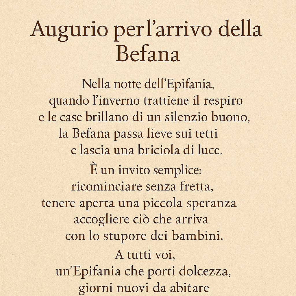 Nella notte dell’Epifania, quando l’inverno trattiene il respiro e le case brillano di un silenzio buono, la Befana passa lieve sui tetti e lascia una briciola di luce.