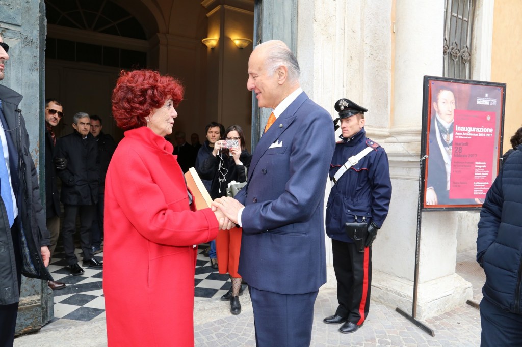 – Valeria Fedeli accolta da Giorgio Girelli all’ingresso del Conservatorio Rossini