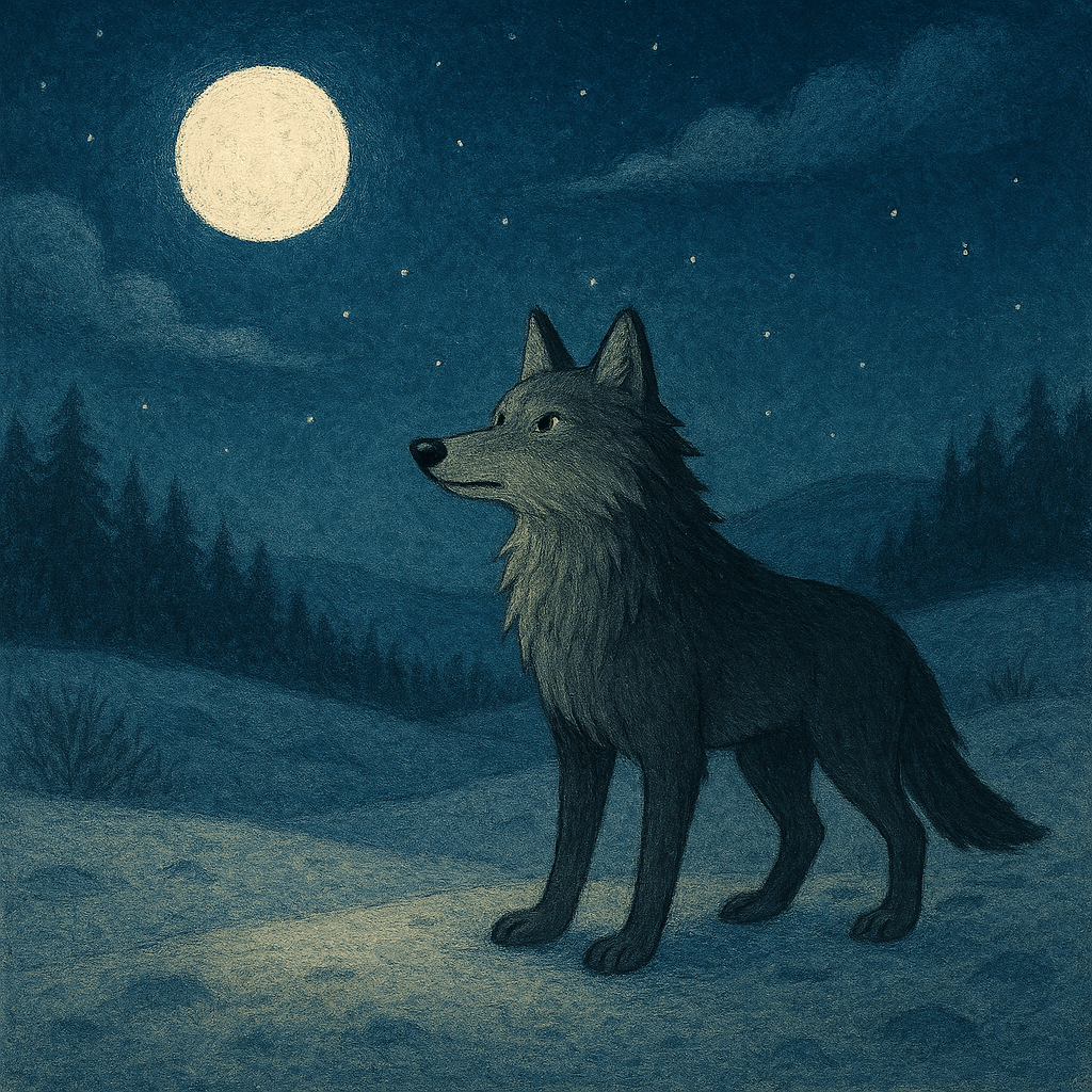 Nel cuore del bosco, dove il tempo si piega, cammina un lupo dal passo leggero. Non cerca prede, né gloria né guerra, ma segue il vento, fratello sincero.