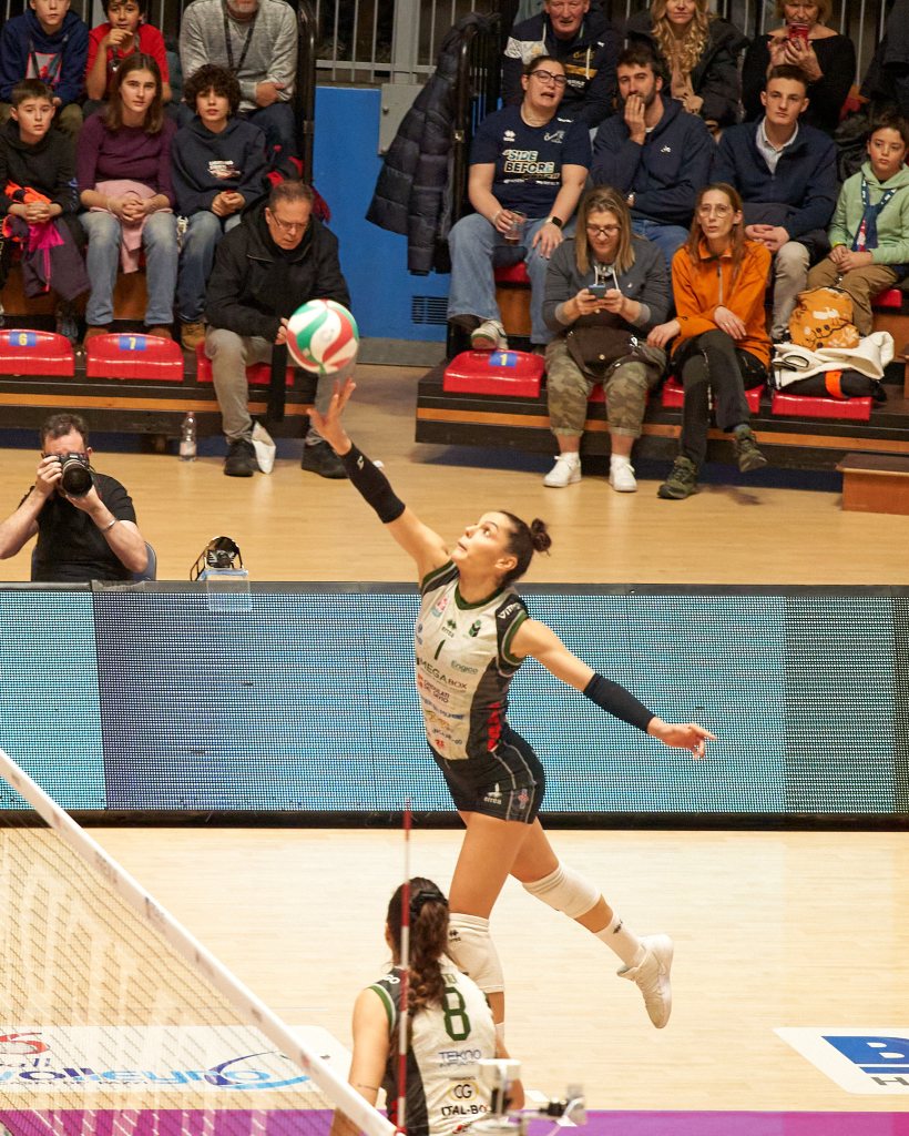 Nel secondo set lo choc per la rimonta subita si fa sentire: Chieri scappa subito dopo il 3-3 iniziale con un parziale di 7-1 (10-4, muro su Giovannini). Entra Lázaro, ma le piemontesi continuano a spingere: un’infrazione delle tigri sigla il 16-7, due ace di Bici e Carletti riducono il distacco a -5, ma Nervini e un errore di Ungureanu al servizio chiudono il set 25-19.