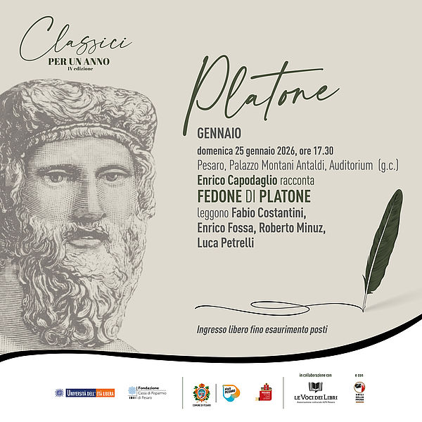 Il primo dei dodici appuntamenti della quarta edizione dell’attesa rassegna Classici per un anno è in programma per domenica 25 gennaio, alle ore 17.30, nell’Auditorium di Palazzo Montani Antaldi (g.c.): Enrico Capodaglio racconta il Fedone di Platone. Ad accompagnarlo, i lettori delle Voci dei Libri APS: Fabio Costantini, Enrico Fossa, Roberto Minuz, Luca Petrelli.