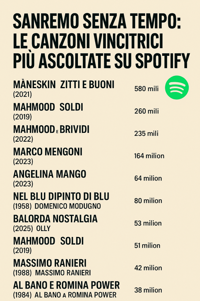 A poche settimane dal Festival di Sanremo 2026, arriva una fotografia interessante su come le canzoni vincitrici della kermesse continuino a vivere – e a competere – nell’era dello streaming. L’analisi, realizzata da Casinos.com sui dati ufficiali Spotify aggiornati a gennaio 2026, mette in fila i 25 brani più ascoltati di sempre tra quelli che hanno conquistato il primo posto al Festival.
