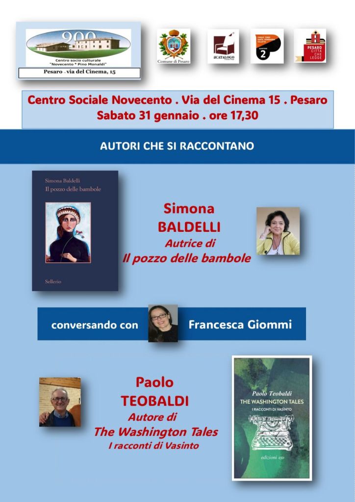 Per la nostra rassegna “Incontri con l’autore”, sabato 31 gennaio alle ore 17,30 nella sala grande del Centro Sociale Novecento – via del Cinema 15 a Pesaro – saranno nostri graditi ospiti i romanzieri Simona Baldelli e Paolo Teobaldi. Sollecitati da Francesca Giommi si racconteranno raccontandoci del loro scrivere, del loro rapporto con il lettore, dei loro romanzi e da dove nascono le loro storie e in generale dell’enorme e anche contraddittorio mondo letterario.