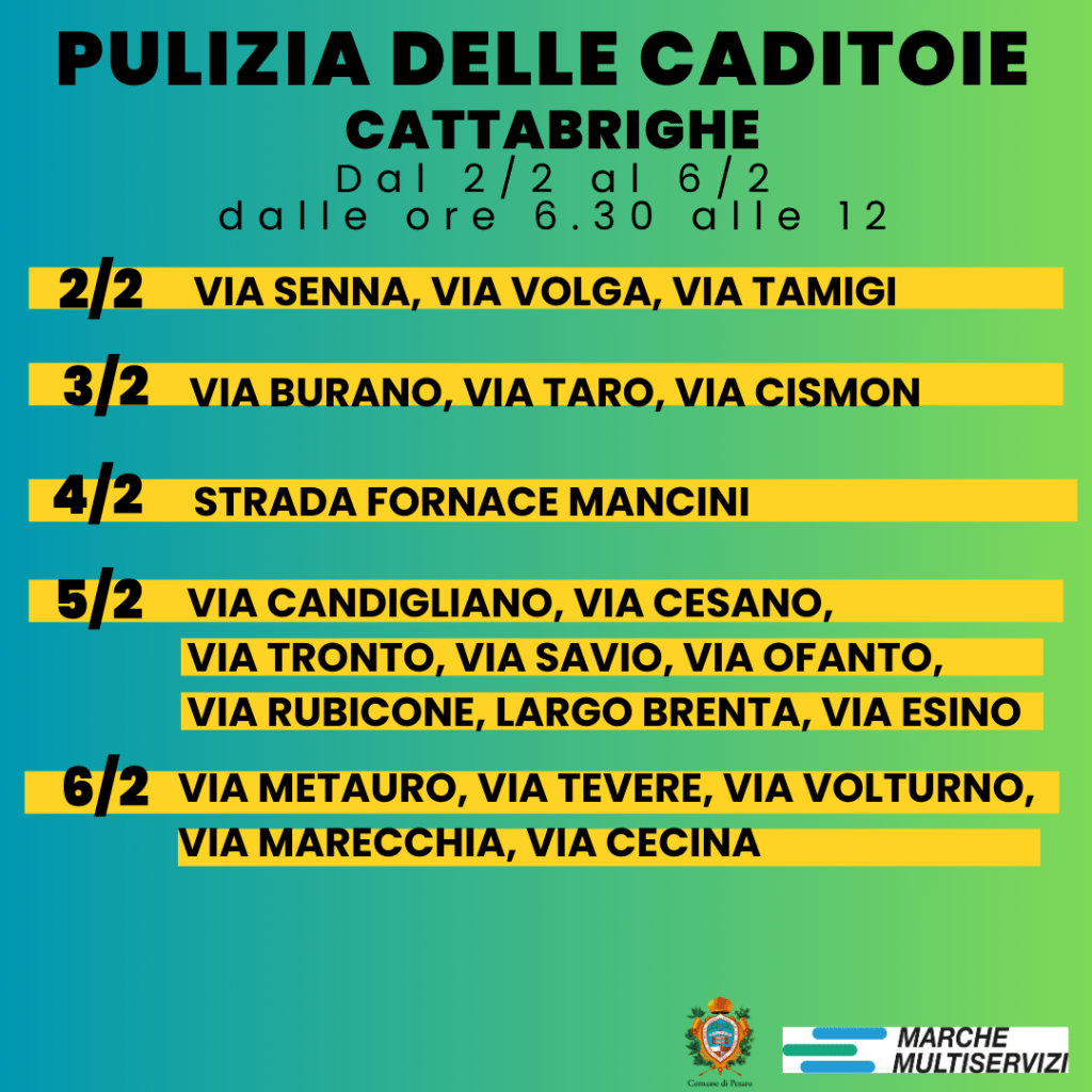 Dopo la pausa natalizia torna la pulizia delle caditoie su suolo pubblico della città. Nella settimana da lunedì 2 al 6 febbraio, Marche Multiservizi in accordo con il Comune di Pesaro, interverrà al mattino in diverse vie delle zone di Cattabrighe.
