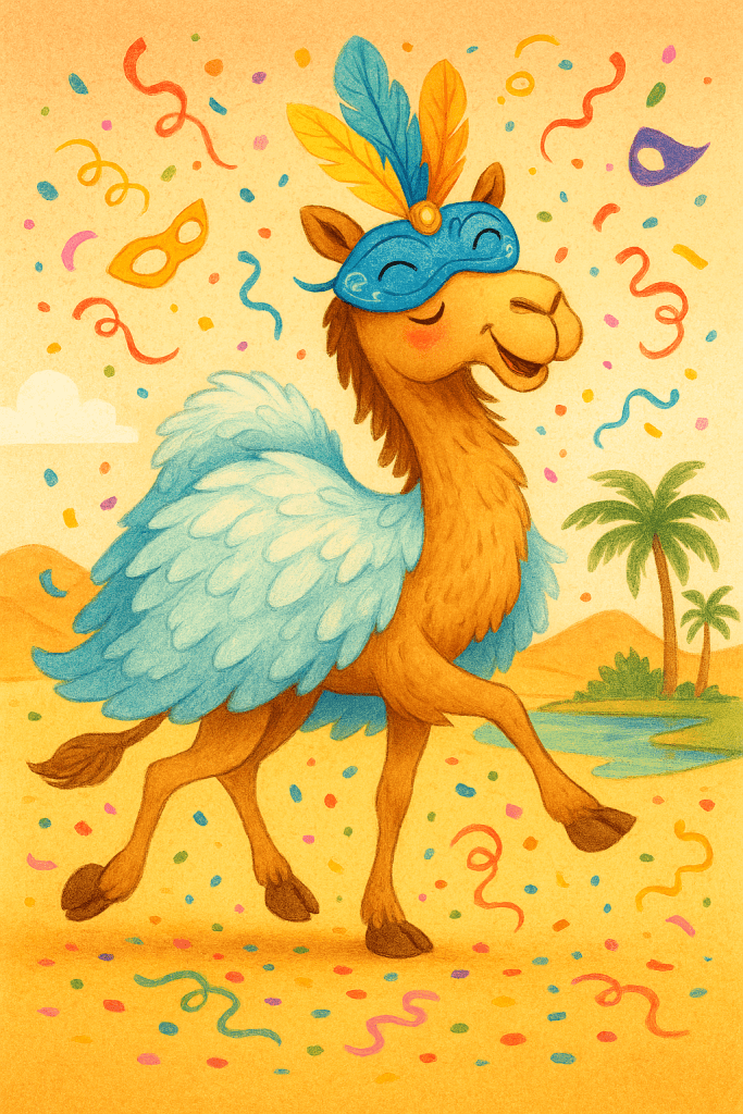 Un giorno, mentre avanzava tra le dune, vide qualcosa di impossibile: una piuma rossa, leggera come una risata, che svolazzava nel vento. Poi una mascherina dorata. Poi un coriandolo.