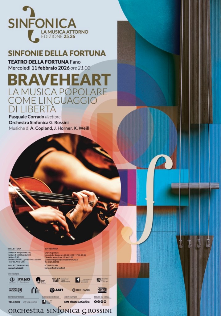 Fano, 07/02/2026 – La musica come voce dei popoli, come memoria collettiva e come spazio di libertà: è questo il filo conduttore di Braveheart, il concerto che l’Orchestra Sinfonica G. Rossini propone mercoledì 11 febbraio 2026 alle ore 21.00 al Teatro della Fortuna di Fano, all’interno della Stagione Sinfonie della Fortuna 2026.