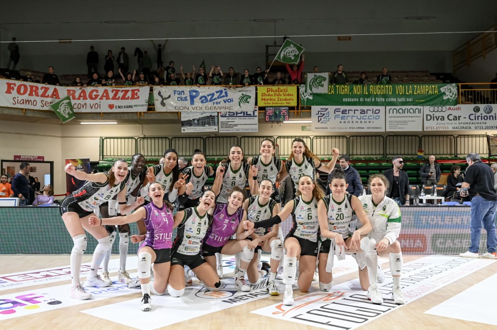 La Megabox Ondulati del Savio Vallefoglia coglie una cruciale vittoria in quattro set sul campo delle cugine della CBF Balducci Macerata e blinda in questo modo il sesto posto: a tre giornate dalla fine della stagione regolare, con nove lunghezze e sei vittorie di vantaggio su Bergamo, settima, le biancoverdi sono ormai irraggiungibili. Tigri sempre avanti in tutti e quattro i set, ma nel secondo, sul 21-16, un improvviso passaggio a vuoto ha consentito alle padrone di casa un parziale di 9-2 che ha rimesso temporaneamente in equilibrio la partita. Da lì in poi, la Megabox è tornata a condurre le operazioni e ad aggiudicarsi gli altri due parziali. Vittoria meritata, con sprazzi di bel gioco nonostante un totale di 38 errori. Bici mvp con 23 punti, il 50% in attacco e 4 ace, bene anche Candi (11 punti con 4 muri) e ancora una volta preziosa Ungureanu dalla panchina (9 punti). Nella CBF Balducci, stoica Decortes, che si è caricata la squadra sulle spalle attaccando 50 palloni e chiudendo con 23 punti.