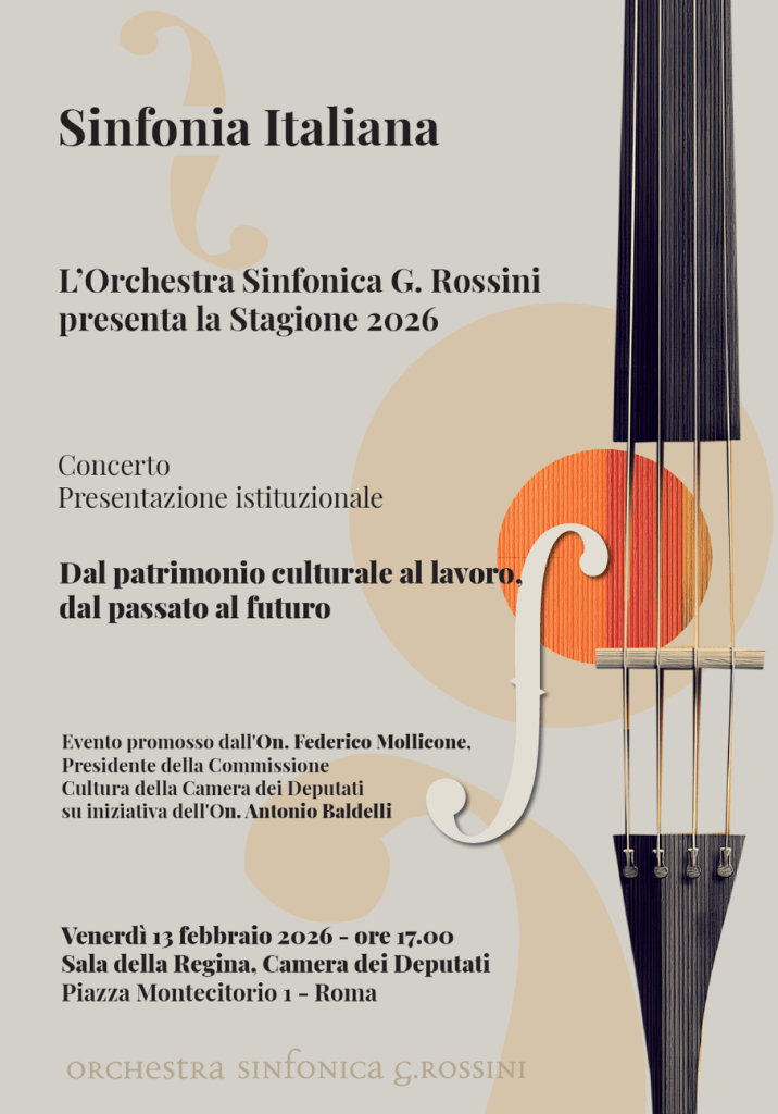 ROMA – Sarà la prestigiosa Sala della Regina della Camera dei Deputati ad accogliere, giovedì 13 febbraio, la presentazione ufficiale della Stagione 2026 dell’Orchestra Sinfonica G. Rossini. Un appuntamento di alto profilo istituzionale, promosso dall’On. Federico Mollicone, Presidente della VII Commissione Cultura, su iniziativa dell’On. Antonio Baldelli, che sancisce il ruolo dell’OSR quale ambasciatrice culturale del territorio marchigiano e modello virtuoso nel panorama nazionale dello spettacolo dal vivo.