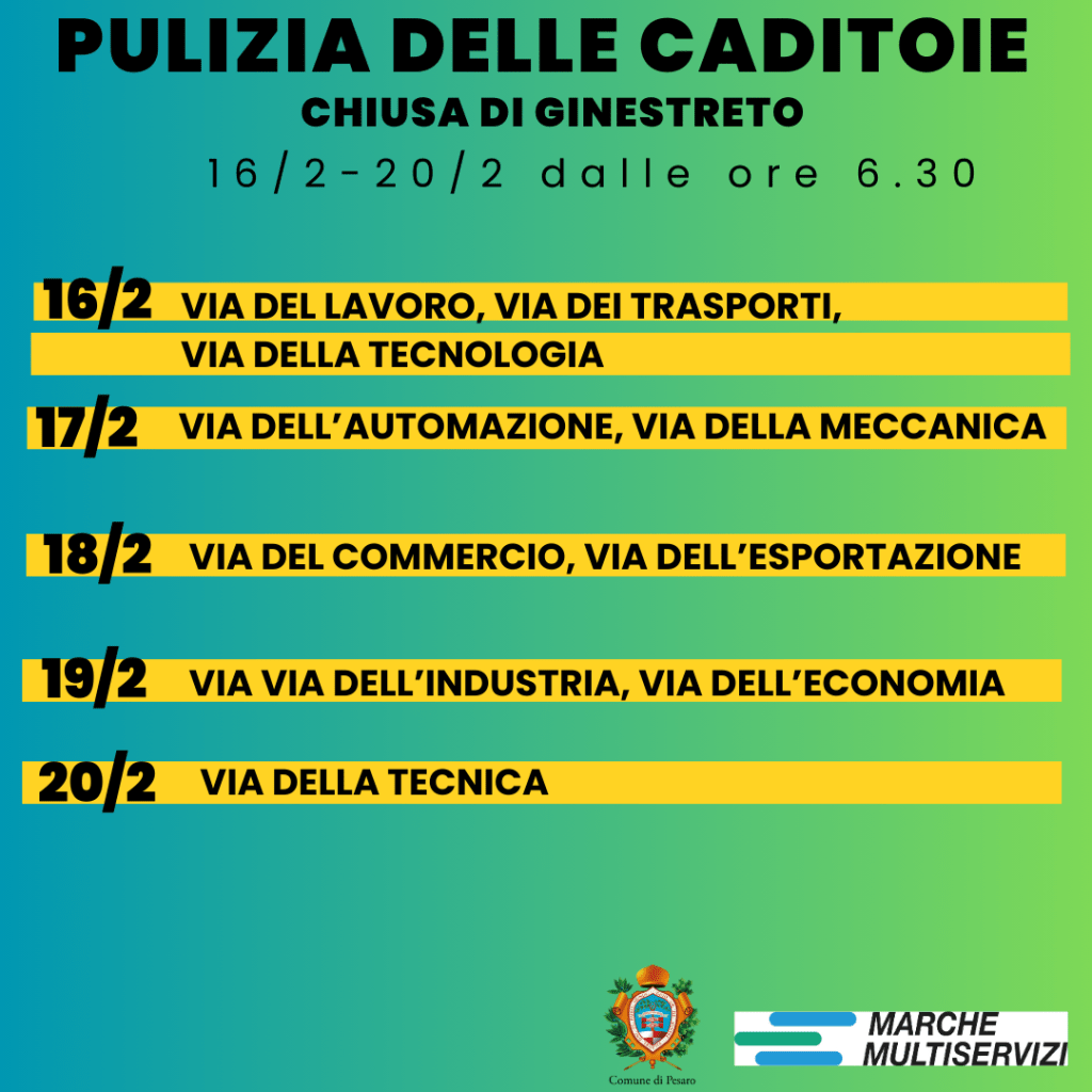 Si prosegue con la pulizia delle caditoie su suolo pubblico della città. Nella settimana da lunedì 16 al 20 febbraio, Marche Multiservizi in accordo con il Comune di Pesaro, interverrà al mattino in diverse vie delle zone della Chiusa di Ginestreto.