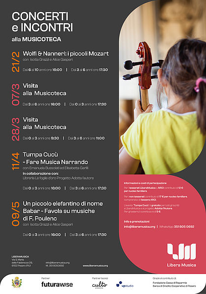 Il via sabato 21 febbraio con Wolfi & Nannerl: i piccoli Mozart, un racconto musicale sull’infanzia di Wolfgang Amadeus Mozart e sua sorella Maria Anna, tra melodie per violino e pianoforte e storie di viaggi, giochi e concerti. L’appuntamento è alle 16.00 per 6-10 anni e alle 17.30 per 3-5 anni. Il calendario prosegue con due visite alla Musicoteca previste per sabato 7 e 28 marzo: il 7, alle 16 per 3-6 anni, alle 17.30 per 0-3 anni; il 28, alle 9.30 per 0-3 anni, alle 11 per 3-6 anni. Sabato 11 aprile è in programma il racconto musicale a cura di LiberaMusica, Tumpa Cucù – Fare Musica Narrando (edizione Carthusia), presentato in collaborazione con la Libreria Le Foglie d’Oro e il progetto Adotta l’Autore, alla presenza delle autrici Emanuela Bussolati ed Elisabetta Garilli: alle 16 per 0-3 anni, alle 17.30 per 3-6 anni. La rassegna si conclude sabato 9 maggio con Un piccolo elefantino di nome Babar, favola musicale sulle musiche di Francis Poulenc, che porta in scena una storia senza tempo tra narrazione e musica dal vivo con Isotta Grazzi e Alice Gasperi. Alle 16 per 0-3 anni e alle 17.30 per 3-6 anni.