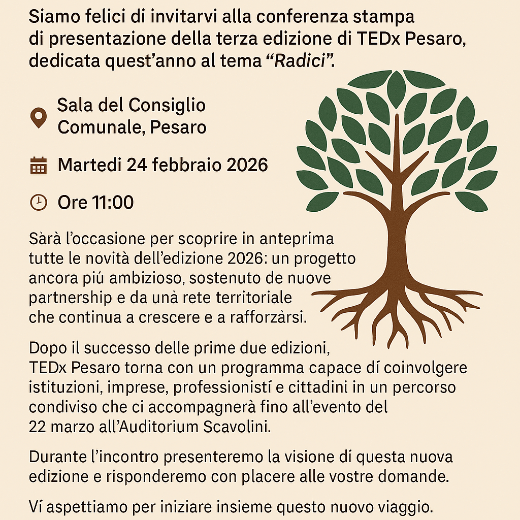 Siamo felici di invitarvi alla conferenza stampa di presentazione della terza edizione di TEDx Pesaro, dedicata quest’anno al tema “Radici”.