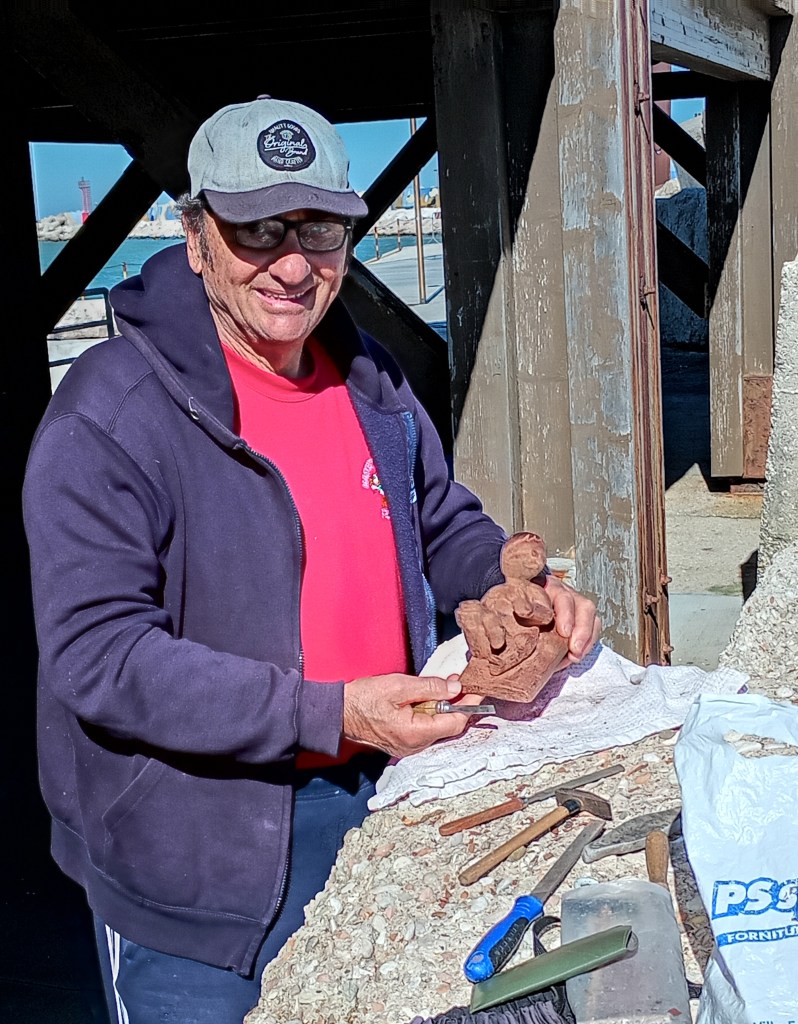 Claudio detto Il Mozzo, l’artista salmastro del Moloco al Porto di Pesaro: batte forte il cuore per l’arte, quella di lavorare pezzi di abete, olmo, faggio e ricavare putti e gufi. Legni teneri e legni duri per sculture che comunicano non solo la bellezza dell’oggetto ma anche la passione di Claudio nel crearle. La scultura in legno è un’arte millenaria che continua ad affascinare per la capacità di trasformare un semplice segmento di albero in un’opera d’arte. Con un kit essenziale di attrezzi Claudio lavora in uno spazio singolare: uno scoglio, sempre lo stesso, corroso dalla salsedine del Mare Nostrum. Scolpire il legno sviluppa pazienza e concentrazione e, soprattutto, favorisce il benessere mentale funzionando come forma di meditazione attiva, come si evince dalla foto che gli ho scattato in una soleggiata mattina di febbraio.
