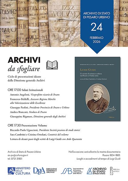 Nell’ambito del ciclo di presentazioni “ARCHIVI da sfogliare”, ideato dalla Direzione generale Archivi del Ministero della Cultura con l’obiettivo di valorizzare e diffondere la propria attività editoriale e promuovere la conoscenza del patrimonio documentario nazionale, martedì 24 febbraio alle ore 17, nella sala conferenze dell’Archivio di Stato di Pesaro (via della Neviera 44) sarà presentato il volume Luigi Guidi. Un uomo di scienza e cultura tra Pesaro e l’Italia unita, seconda uscita della nuova collana “Pubblicazioni degli Archivi di Stato – Saggi”, edita in collaborazione con la casa editrice Viella.