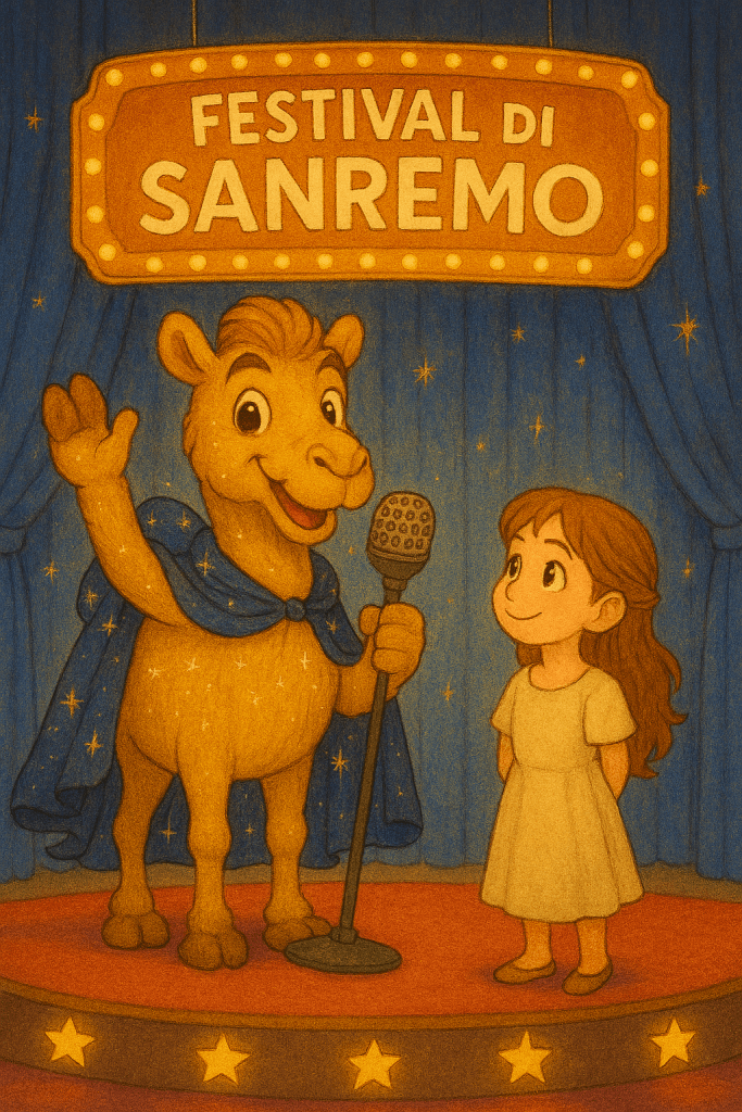 Un giorno, mentre cantava una melodia dolce tra le Dune Sussurranti, una farfalla messaggera gli portò una notizia incredibile: “Cammello Caramello, sei stato scelto per partecipare al Festival di Sanremo!”