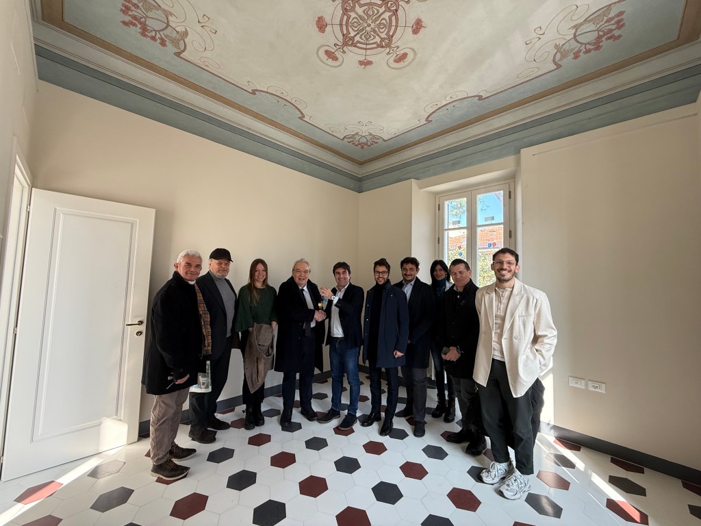 Sindaco, vicesindaco assessore alla Cultura e assessore alle Nuove Opere presentano i lavori che hanno restituito alla città due piani di via Cattaneo 65, che potranno ospitare fino a 10 studenti o artisti, inaugurati insieme al presidente dall’Ongaro e al direttore Della Chiara del ROF