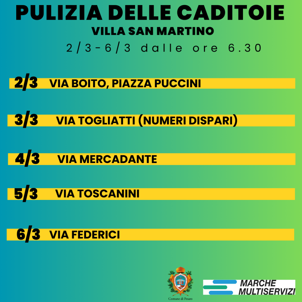 Prosegue la pulizia delle caditoie su suolo pubblico della città. Nella settimana da lunedì 2 al 6 marzo, Marche Multiservizi in accordo con il Comune di Pesaro, interverrà al mattino in diverse vie delle zone di Villa San Martino.