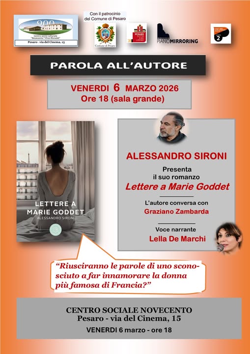 Venerdì 6 marzo alle ore 18, Alessandro Sironi – compositore milanese, pianista, ideatore di PianoMirroring e della Psicologia musicare – sarà al Centro Socioculturale Novecento in via de Cinema 15 a Pesaro per parlarci del suo fortunato romanzo Lettere a Marie Goddet (500 copie vendute nei primi 100 giorni): una storia d’amore che è molto più di una storia d’amore, l’impossibile incontro fra due mondi che non potevano essere più diversi e distanti.