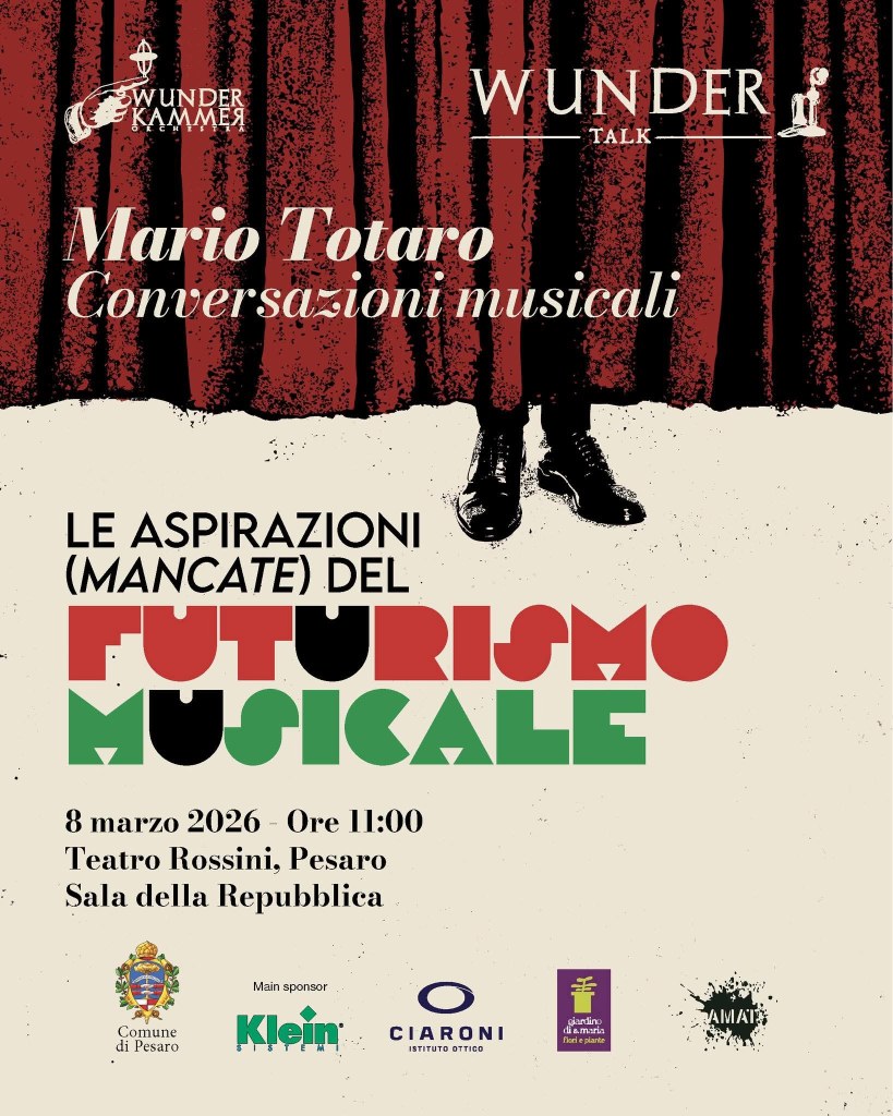 Non solo Rossini: alle 11 nella Sala della Repubblica del Teatro Rossini WunderKammer Orchestra presenta ‘Le aspirazioni (mancate) del futurismo musicale’, una nuova tappa del ciclo di conferenze con il compositore e pianista Mario Totaro dedicate ad alcuni tra i maggiori innovatori della storia della musica tra la fine dell’800 e i nostri giorni. Si andrà alla scoperta di un movimento nato in Italia agli inizi del ‘900, in un’epoca di trasformazioni radicali e progresso tecnologico, che ha introdotto elementi di innovazione importante anche nella musica. Biglietti da 1 a €8, biglietteria Teatro Sperimentale 0721 387548 (mercoledì-sabato 17-19.30), online www.vivaticket.com. Info info@wunderkammerorchestra.com 366 6094910.