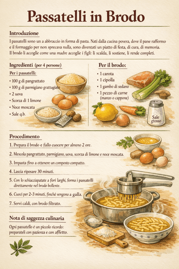 I passatelli sono un abbraccio in forma di pasta. Nati dalla cucina povera, dove si usava il pane raffermo e il formaggio per non sprecare nulla, sono diventati un piatto di festa, di cura, di memoria. Il brodo li accoglie come una madre accoglie i figli: li scalda, li sostiene, li rende completi.