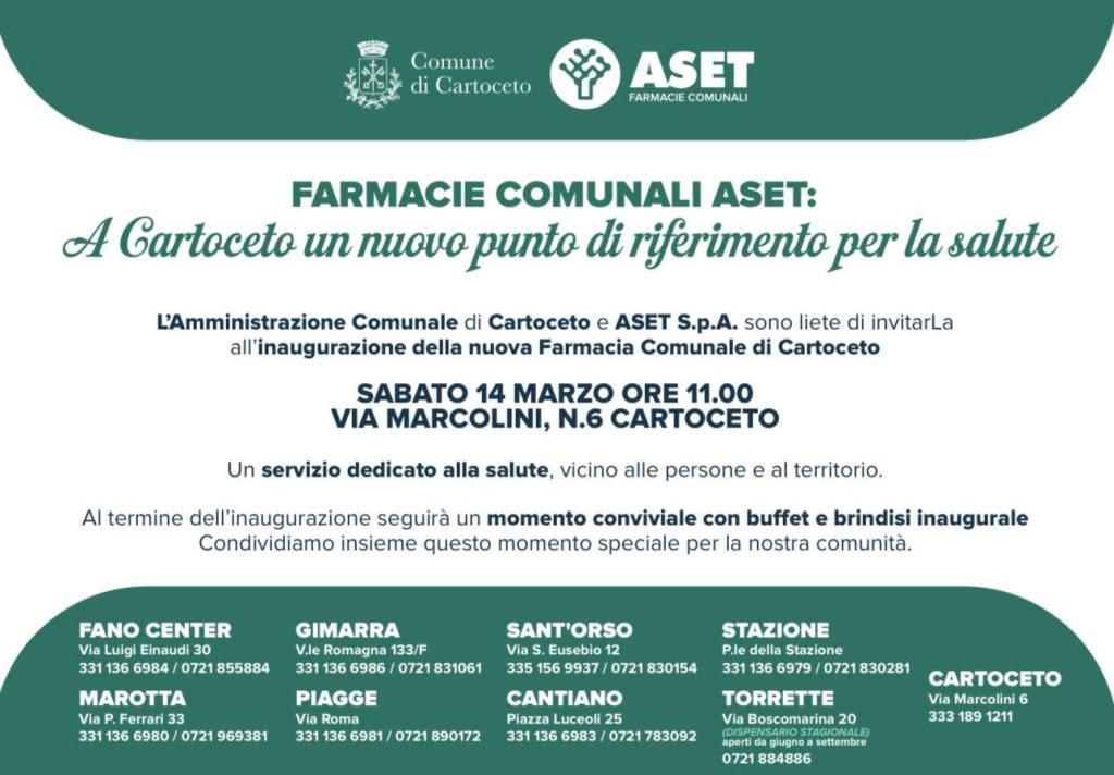 Il Comune di Cartoceto si appresta a inaugurare ufficialmente la nuova Farmacia Comunale del Capoluogo: l’appuntamento è per sabato 14 marzo, alle ore 11.00, in via Marcolini 6, nel cuore del centro storico di Cartoceto.