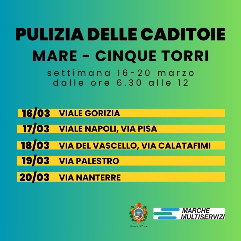 | Continua la pulizia delle caditoie su suolo pubblico della città. Nella settimana da lunedì 16 a venerdì 20 marzo, Marche Multiservizi in accordo con il Comune di Pesaro, interverrà al mattino dalle ore 6.30 alle 12 in diverse vie del Q11 “Porto-Mare” e nel Q2 “Cinque Torri-Santa Veneranda”. Il calendario degli interventi che interesserà circa 260 caditoie prevede: lunedì 16 marzo – viale Gorizia (Q11);martedì 17 marzo – viale Napoli, via Pisa (Q11);mercoledì 18 marzo – via del Vascello, via Calatafimi (Q2);giovedì 19 marzo – via Palestro (Q2);venerdì 20 marzo – via Nanterre (Q2). L’orario delle operazioni potrà subire variazioni per motivi legati al traffico. Per agevolare la pulizia, sono previsti dei divieti di sosta (e rimozione dei mezzi) nelle vie interessate, indicate tramite segnaletica posizionata almeno 48 ore prima dell’intervento. Invitiamo i residenti ad usare senso civico e rispettare i divieti, al fine di poter agevolare il lavoro degli operatori. Oltre alla pulizia delle caditoie verranno eseguiti sopralluoghi specifici da parte di Marche Multiservizi, finalizzati all’attivazione del servizio di spazzamento stradale per rimuovere eventuali residui. L’accordo con l’azienda prevede anche che vengano segnalate le parti “più critiche” della città. Non solo di caditoie, ma anche le tubature che spesso sono ostruite a causa di corpi estranei come gli scarti dei lavori di muratura delle abitazioni (calcinacci) o la spazzatura legata ai cittadini che spazzano la strada. Comune di Pesaro |