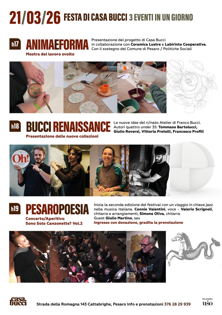 Un’anticipazione della rassegna che vuole accendere il dialogo grazie alla forza dell’arte poetica – un’eccellenza culturale a Pesaro – proposta in una chiave anticonvenzionale e vitale, invitando il pubblico a partecipare e a lasciarsi coinvolgere. Ispirato alla storica esperienza di “Milano Poesia”, fondata da Gianni Sassi – di cui Casa Bucci custodisce l’archivio – il festival si terrà in autunno come spazio di attraversamento tra generazioni, linguaggi e memorie, attivando sinergie tra librerie, spazi culturali, artisti e artigiani del territorio, ma già in primavera sono previsti altri appuntamenti in anteprima a sorpresa.
