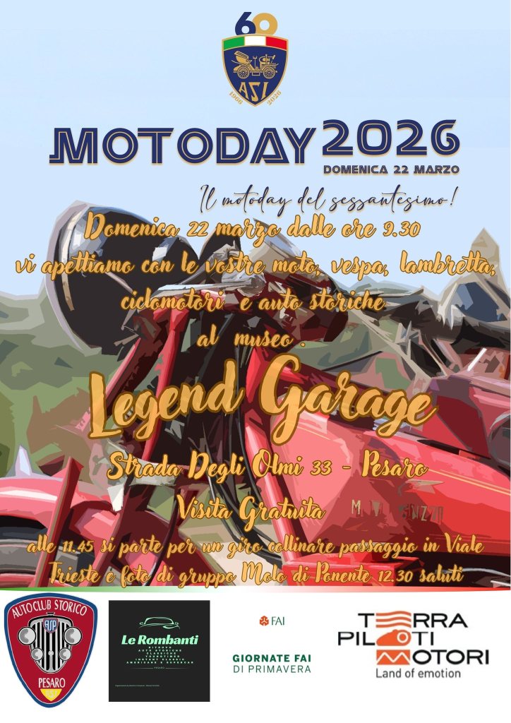 Il momento clou del weekend sarà domenica 22 marzo, quando il Legend Garage ospiterà, dalle ore 9.30, il ritrovo de “Le Rombanti”, appuntamento mensile libero e gratuito dedicato agli appassionati di motorismo storico, che da questa occasione sarà aperto anche a motociclette, Lambrette, Vespe, ciclomotori e motorette con almeno 20 anni di età. L’evento si inserisce nell’ASI Moto Day, manifestazione nazionale promossa dall’Automotoclub Storico Italiano, per valorizzare il patrimonio storico a 2 ruote, e vedrà anche un collegamento in diretta streaming con gli altri club federati italiani che aderiscono all’iniziativa.