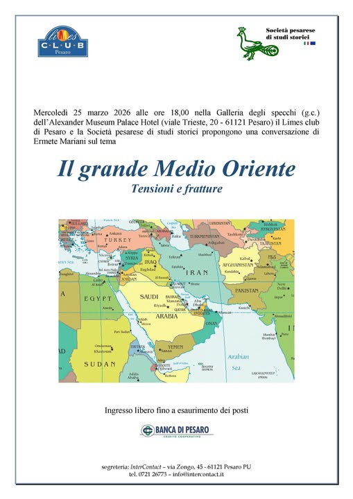 | Mercoledì 25 marzo 2026 alle ore 18,00 nella Galleria degli specchi (g.c.) dell’Alexander Museum Palace Hotel (viale Trieste, 20 – Pesaro) il Limes club di Pesaro e la Società pesarese di studi storici propongono una conversazione di Ermete Mariani sul tema Il grande Medio Oriente Tensioni e fratture Il Medio Oriente è una delle regioni di instabilità del pianeta. La creazione di frontiere del tutto artificiali dopo la fine del dominio ottomano, l’inserimento conflittuale dello Stato di Israele in Palestina nel 1948, le tensioni inter-etniche, le rivalità religiose, infine le grandi risorse energetiche fanno di quell’area tormentata – che si estende dalla Siria al Pakistan – un tenace focolaio di conflitti, come eventi recentissimi ci ricordano ogni giorno. Ermete Mariani si è formato all’Università Ca’ Foscari di Venezia in Lingua e Civiltà Araba e a Sciences Po Parigi in Politica del Mondo Arabo e Musulmano; ha poi studiato e lavorato tra Europa e Vicino Oriente. Le relazioni fra la transizione energetica e i nuovi equilibri tra Mediterraneo ed Europa sono al centro dei suoi interessi. Il suo attuale impegno come responsabile di progetti di cooperazione per la transizione energetica presso un’associazione europea di autorità locali si inserisce in un percorso di esperienze come analista di relazioni internazionali e sicurezza nel mondo arabo e musulmano, nonché come giornalista presso AdnKronos International a Roma. Ingresso libero fino a esaurimento dei posti |