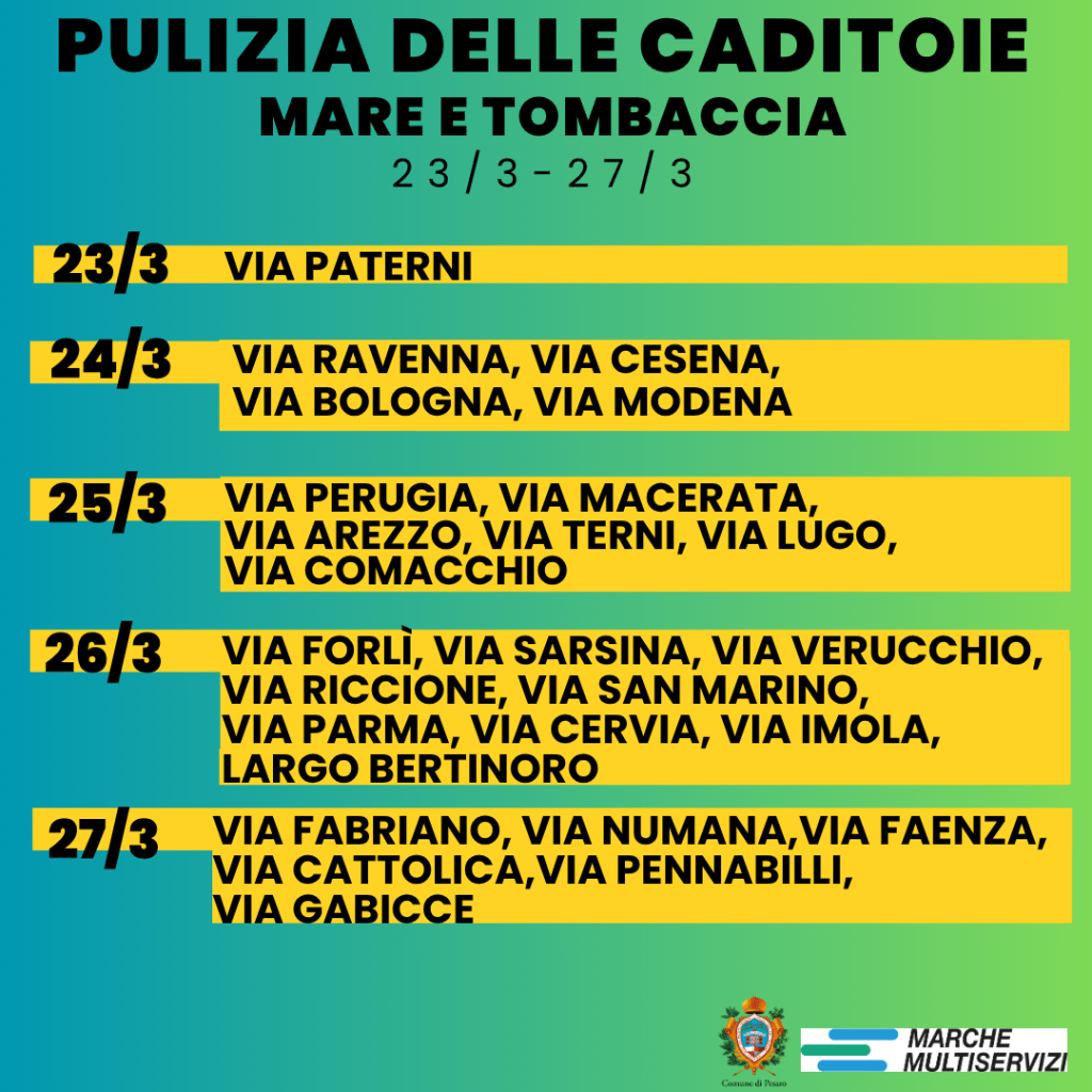 Si prosegue con la pulizia delle caditoie su suolo pubblico della città. Nella settimana da lunedì 23 al 27 marzo, Marche Multiservizi in accordo con il Comune di Pesaro, interverrà al mattino in diverse vie delle zone del Mare e Tombaccia