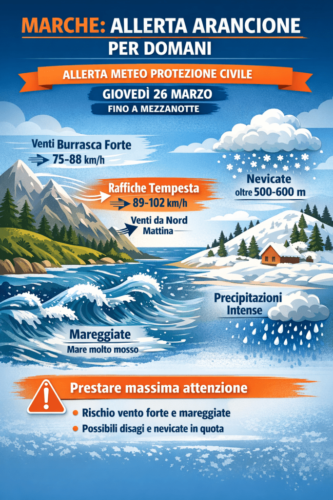 Il mare sarà molto mosso o agitato, con mareggiate lungo l’intero litorale marchigiano. Previste inoltre precipitazioni diffuse, con nevicate oltre i 500–600 metri; durante i rovesci più intensi il limite potrà temporaneamente abbassarsi.