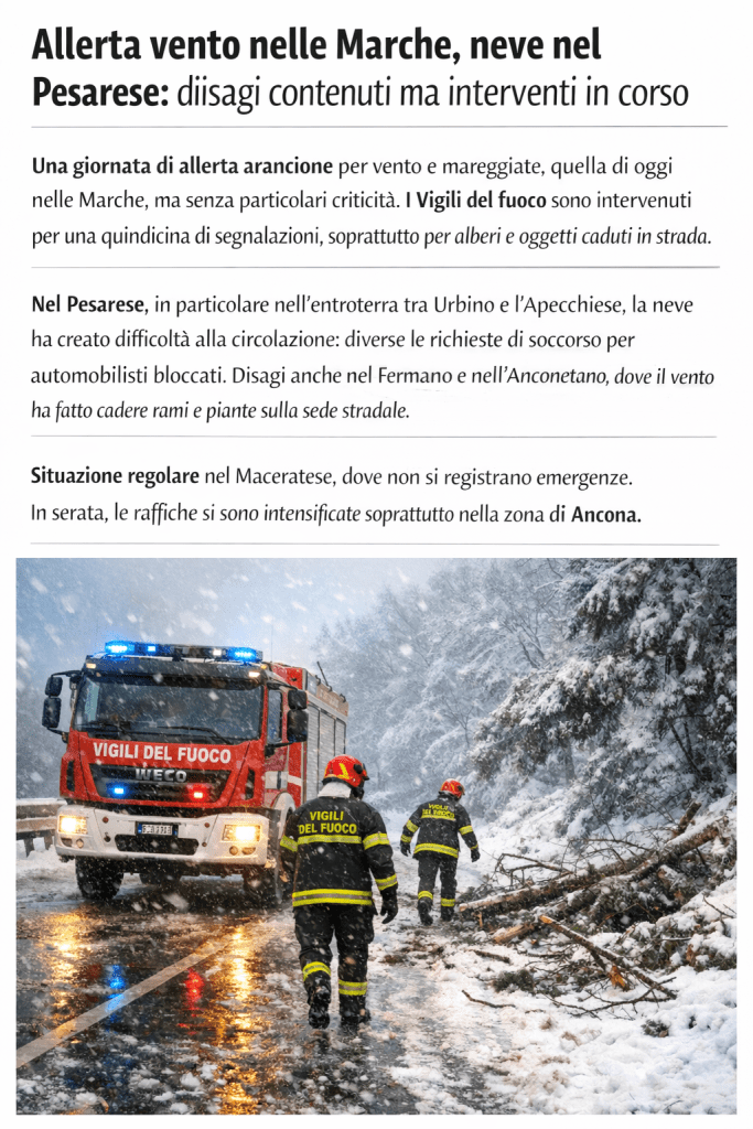 Nel Pesarese, in particolare nell’entroterra tra Urbino e l’Apecchiese, la neve ha creato difficoltà alla circolazione: diverse le richieste di soccorso per automobilisti bloccati. Disagi anche nel Fermano e nell’Anconetano, dove il vento ha fatto cadere rami e piante sulla sede stradale.