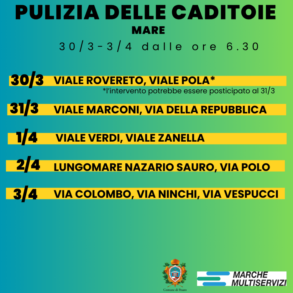 Si prosegue con la pulizia delle caditoie su suolo pubblico della città. Nella settimana da lunedì 30 marzo al 3 aprile, Marche Multiservizi in accordo con il Comune di Pesaro, interverrà al mattino in diverse vie delle zone del Mare