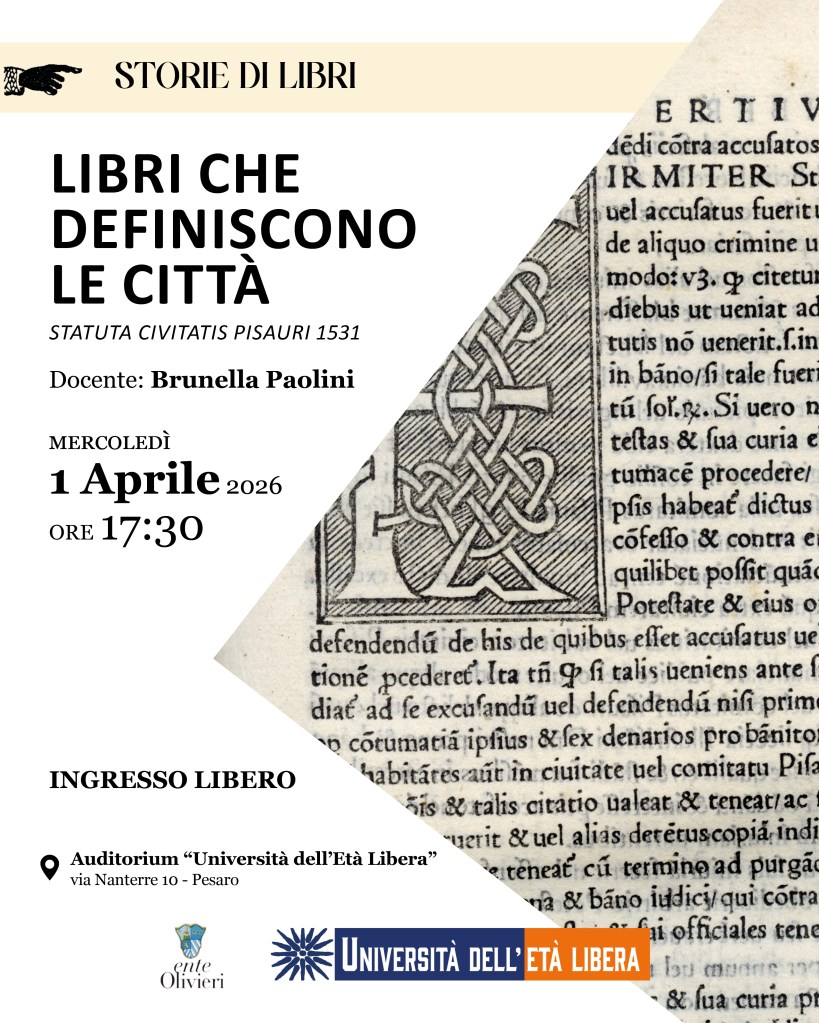 I primi due appuntamenti, uno dedicato agli “Statuta Civitatis Pisauri” del 1531, l’altro alla Cronaca di Norimberga del 1493 (Liber Chronicarum), esplorano come i libri seppero “plasmare” la visione della città e del mondo.