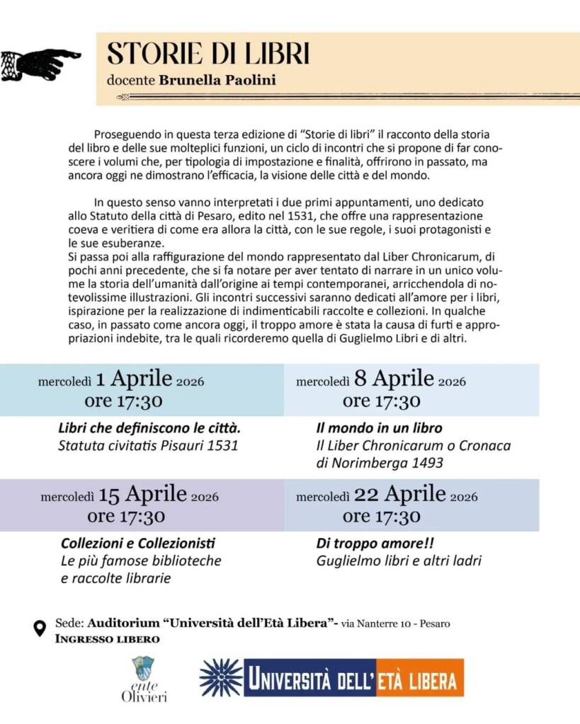 Dopo il successo delle precedenti edizioni, ritorna un appuntamento particolarmente atteso per l’Università dell’Età Libera: il seminario “Storie di Libri”, a cura di Brunella Paolini, direttrice dell’Ente Olivieri. Quattro incontri a partire da mercoledì 1 aprile fino al 22 aprile, per scoprire le mille sfaccettature, molte inedite e curiose, di un oggetto capace di raccontare mondi, definire città, scatenare passioni collezionistiche talvolta evolute in vere e proprie ossessioni.