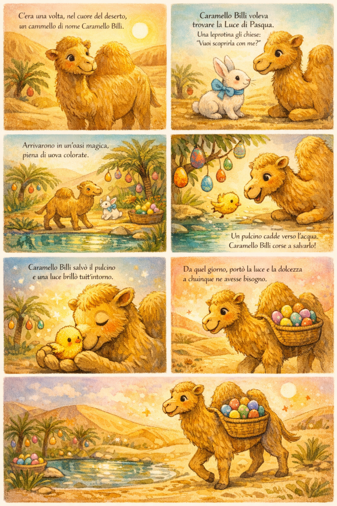 Caramello Billi aveva un sogno: voleva scoprire dove nascesse la Luce di Pasqua, quella che ogni primavera rendeva il deserto più morbido, l’aria più gentile e i cuori più leggeri.