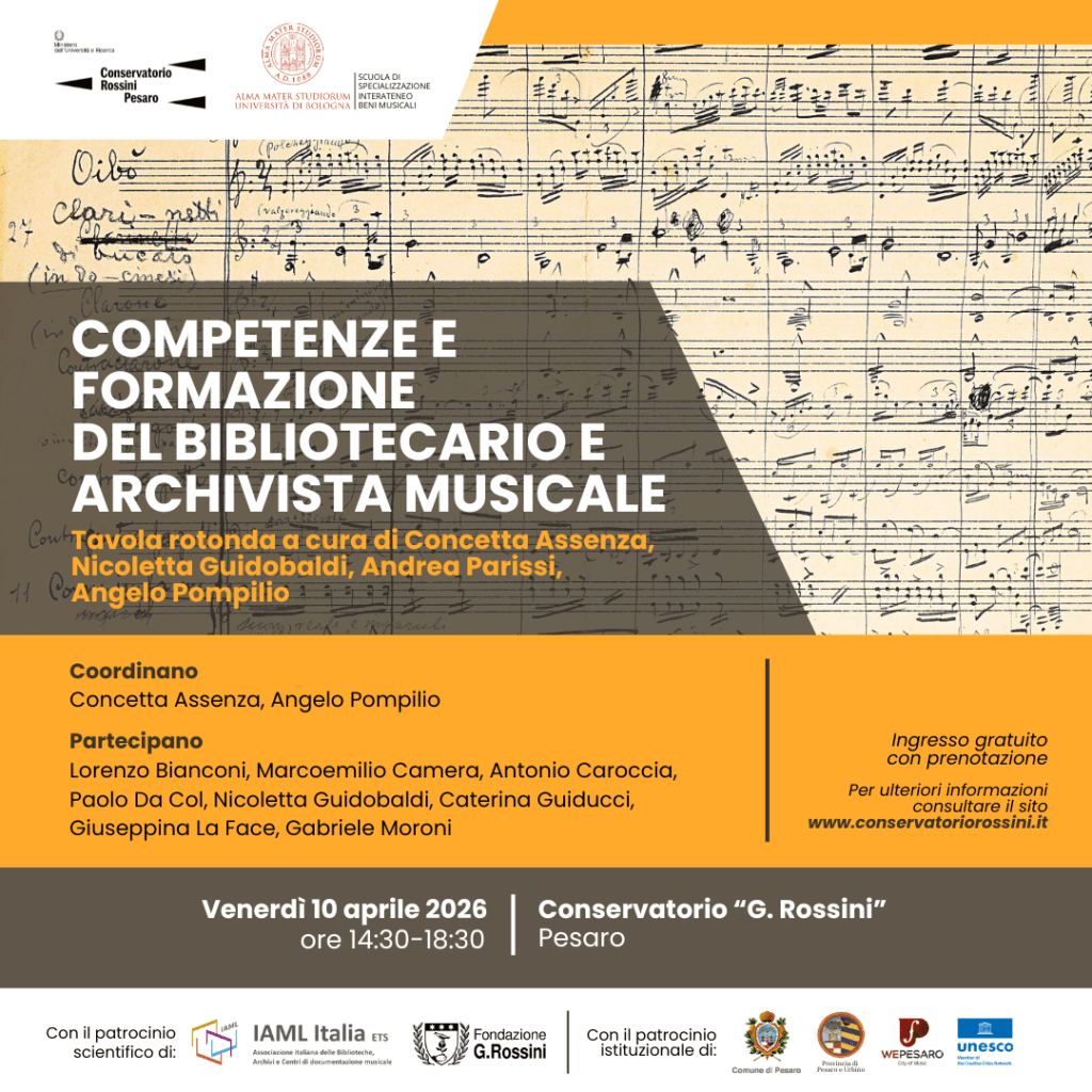Venerdì 10 aprile 2026, dalle ore 14.30 alle 18.30, presso il Conservatorio “G. Rossini” di Pesaro (ingresso gratuito su prenotazione) si svolgerà la tavola rotonda “Competenze e formazione del bibliotecario e archivista musicale”, a cura di Concetta Assenza, Nicoletta Guidobaldi, Andrea Parissi e Angelo Pompilio. L’iniziativa, promossa dal Conservatorio “G. Rossini” in collaborazione con la Scuola di Specializzazione in Beni musicali dell’Università di Bologna, vede anche la collaborazione di IAML Italia e della Fondazione Rossini.