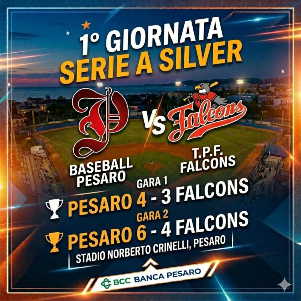 Il Baseball Pesaro inaugura la stagione nel migliore dei modi, conquistando due successi interni contro i T.P.F. Falcons nella giornata d’apertura della Serie A Silver. Sul diamante dello stadio Norberto Crinelli la formazione pesarese ha mostrato solidità sul monte, attenzione difensiva e capacità di reagire nei momenti chiave.