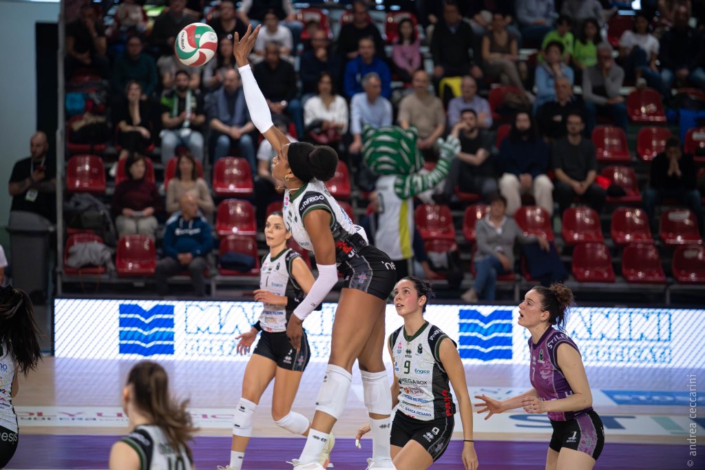 Nel secondo set due errori in fila della Honda dànno il primo mini break alle biancoverdi, che poi allungano con Candi che punisce una ricezione lunga e mura il successivo attacco di Diop (5-1). Un altro muro di Candi e una parallela di Bici siglano il +6, un ace di Ungureanu sigla il 10-3. Esce Pucelj per Marring, Candi mura ancora Diop, che sbaglia la palla successiva (12-4). Entrano Cecconello, Pritchard e Allaoui, un ace di Rivero rianima la Honda, ma Bici la ricaccia indietro (15-7). Marring sbaglia l’attacco successivo, Omoruyi firma la pipe del +10. Un attacco di seconda di Bartolucci fissa il punteggio sul 20-9, Bici trova il set-point, chiude un errore al servizio di Signorile (25-14).
