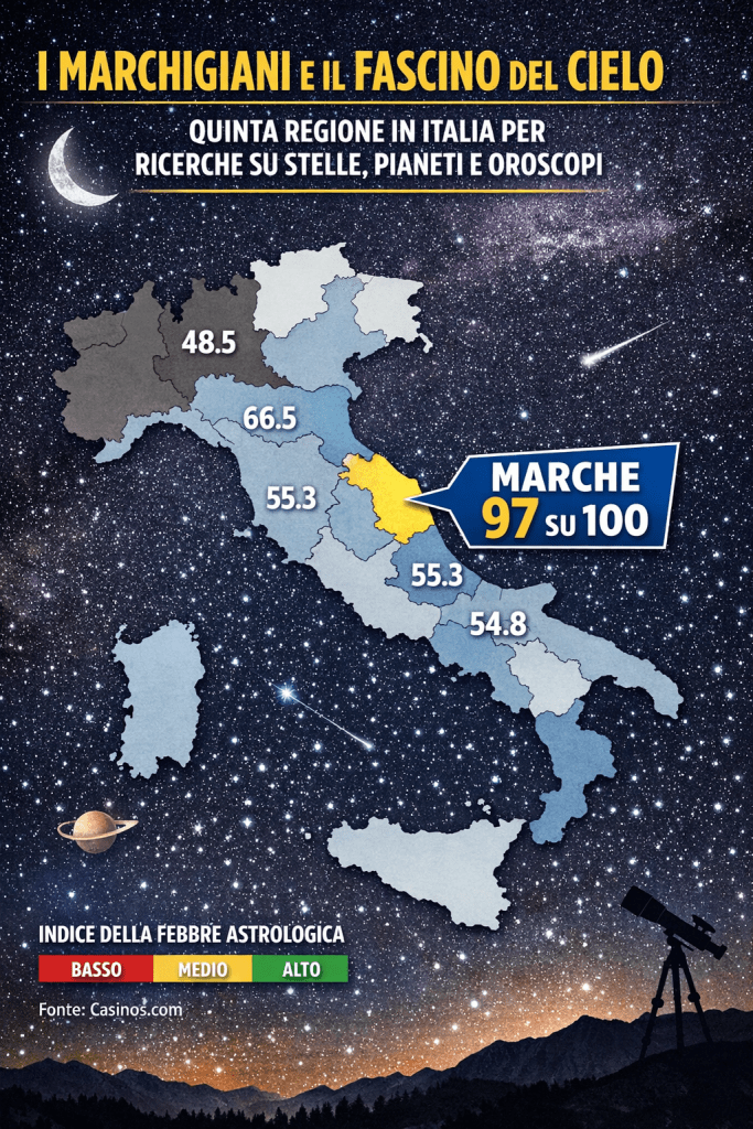 Alla vigilia della settimana astronomica più intensa dell’anno — con la parata di pianeti del 18 aprile, il perielio della cometa C/2025 R3 PanSTARRS il 19 e il rientro della missione Artemis II — le Marche si confermano tra le regioni più affascinate dal cielo. Secondo l’Indice della Febbre Astrologica (IFA) elaborato da Casinos.com su cinque anni di ricerche Google, la regione si colloca al quinto posto nazionale per interesse verso stelle, pianeti e oroscopi.