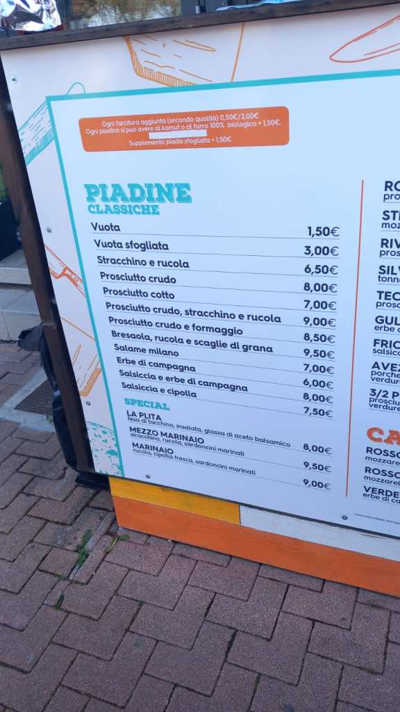 Il menù completo sarà disponibile a breve, ma la base è già chiara: piadine, specialità della casa e una proposta coerente con l’identità del brand.