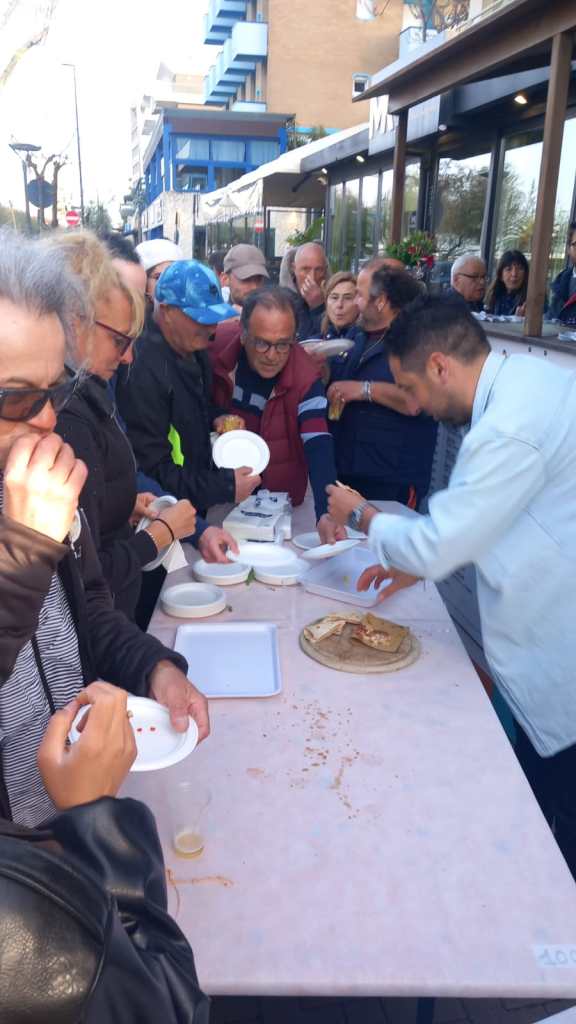 Da domani sarà disponibile a 7 euro, ma oggi è protagonista assoluto di una serata senza prezzo, dove conta solo l’esperienza è la classica piada farcita tagliata a spicchi, birra e patatine come se piovessero.