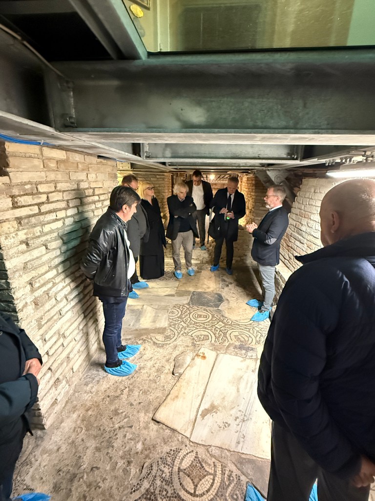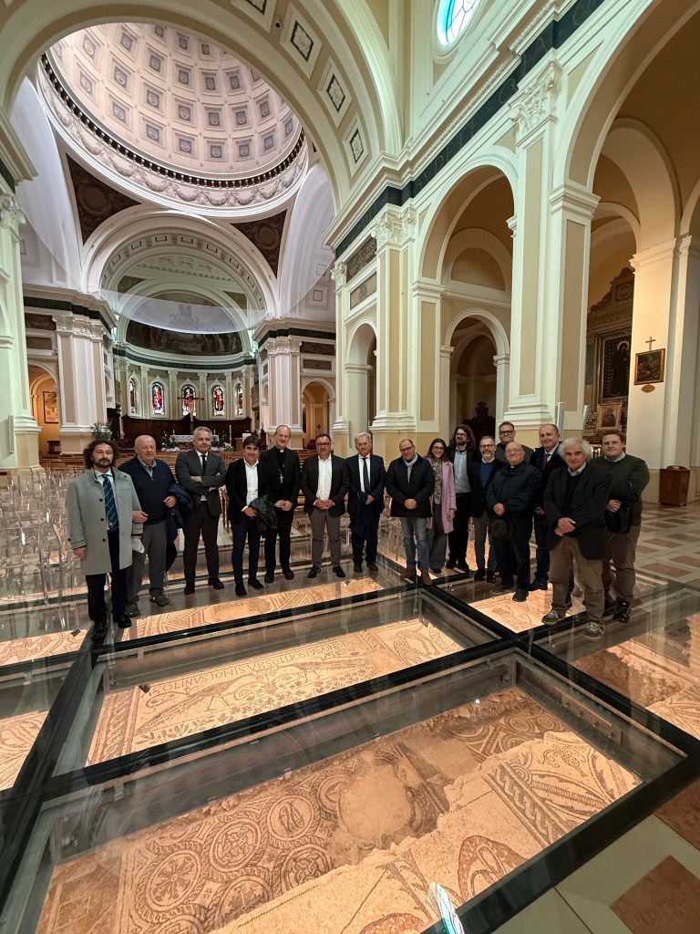 Si è svolto il primo incontro ufficiale tra il Comune di Pesaro, Soprintendenza, Arcidiocesi, Università degli Studi di Urbino – con la cattedra di archeologia medievale che dirige i lavori di studio della Cattedrale – e una delegazione della Fondazione Aquileia in visita a Pesaro, con l’obiettivo di avviare una collaborazione dedicata alla valorizzazione dei mosaici di entrambe le città. L’incontro nasce dalla proposta lanciata dal soprintendente Andrea Pessina in occasione dell’inaugurazione, nell’autunno 2025, delle nuove vetrate sui mosaici della Cattedrale di Pesaro, lavoro interamente finanziato dalla Fondazione Scavolini. «Ritengo sia importante fare tesoro delle esperienze maturate in questi anni da una realtà archeologica eccezionale quale quella di Aquileia, che ho avuto modo di apprezzare in occasione del mio precedente incarico – ha sottolineato il soprintendente Pessina -. L’intento è quello di avviare incontri e iniziative che possano portare ad una corretta valorizzazione del patrimonio archeologico di Pesaro e siano occasione di studio e riflessione sullo straordinario significato di queste testimonianze musive».