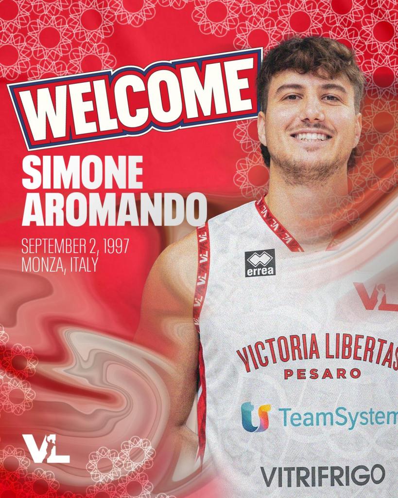 La Victoria Libertas Pallacanestro Pesaro comunica di aver raggiunto un accordo valido fino al termine dell’attuale stagione sportiva con il giocatore Simone Aromando. Ala grande, classe 1997, 200 cm, proviene dalla Gemini Mestre: in questo 2025/2026 con i veneti ha disputato 35 match con una media di 22.8 minuti, 10.3 punti e 4.9 rimbalzi per gara, oltre al 45% da due punti e il 40% da tre.
